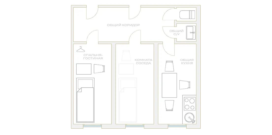 «Комната Остапа Бендера в коммунальной квартире была узкая, с одним окном на двор. В ней стояли кровать, столик, стул и вешалка. Из комнаты дверь вела в коридор, где была общая кухня с плитой и раковиной, а дальше — ванная и уборная».