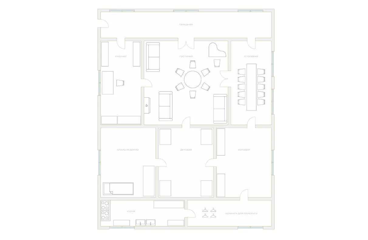 Лев Толстой тоже не обошел вниманием дома, квартиры и гостиные, которые упоминаются в романе. А планировку удалось создать благодаря вот этой цитате: «Квартира Облонских занимала весь второй этаж большого дома. В центре была большая гостиная с мягкой мебелью и камином, из которой двери вели в столовую, кабинет Стивы и детскую. Спальня Долли находилась рядом с детской. Кухня и комнаты для прислуги располагались в задней части квартиры, а из передней можно было выйти на парадную лестницу…».