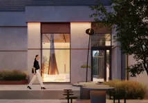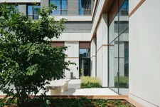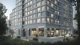 Входная группа оформлена как гранд-лобби с потолками высотой до 5 метров, витражными окнами и зоной отдыха у камина. Интерьер выдержан в нейтральных природных тонах, подчёркивающих атмосферу уюта и спокойствия.