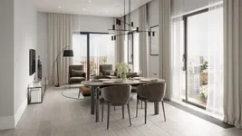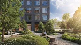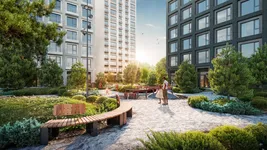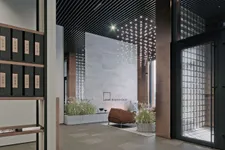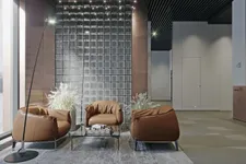 Лобби выполнены в минималистичном дизайне с панорамными окнами и высокими потолками, что создаёт ощущение простора и уюта. Использование экологичных материалов, таких как стекло, металл и керамогранит, подчёркивает статус и современность комплекса.