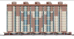 Проект новостройки выполнен в современном архитектурном стиле, где главными элементами стали простота и функциональность. Чёткие формы и прямые линии задают строгий, но при этом гармоничный силуэт зданий. Здания имеют ступенчатую структуру с переменной этажностью. Такая архитектурная приём снижает ощущение массивности и придаёт объёму динамичность и глубину. Особое внимание уделено угловым секциям с панорамным остеклением. Оно не только подчёркивает современный стиль комплекса, но и наполняет квартиры естественным светом, создавая комфортную атмосферу. Фасады облицованы кирпичом и плиткой. Два оттенка — тёплый песочный и глубокий терракотовый, придают экстерьеру выразительный ритм и живое визуальное разнообразие. Светлые вставки в отделке подчёркивают оконные проёмы и балконы, добавляя лёгкости и изящества в общий образ.