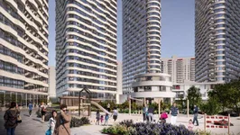 Территория вокруг комплекса площадью более 2 гектаров будет благоустроена. Здесь спроектированы детские и спортивные площадки, прогулочные зоны, террасы для отдыха, а также фонтан со светомузыкальной подсветкой. По вечерам дорожки и скверы будут освещаться светодиодами, а в зонах активностей появятся уличные тренажеры, площадка для йоги и павильоны для встреч.