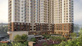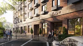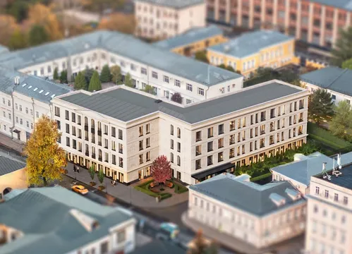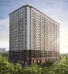 Здание спроектировано в Г-образной форме и выполнено в современном европейском стиле с акцентом на классические пропорции. Архитектурное решение построено на контрасте цветовых оттенков: темно-коричневый цоколь сочетается со светлыми бежевыми фасадами и вертикальными акцентами более насыщенного цвета. Ритмика фасадов формируется четкой сеткой оконных проемов и балконов, что придает облику здания упорядоченность и лаконичность. Композицию завершает выразительный карниз под плоской кровлей, визуально усиливающий вертикаль и придающий архитектуре завершенный характер. Внутренние пространства оформят в том же сдержанном минималистичном стиле.